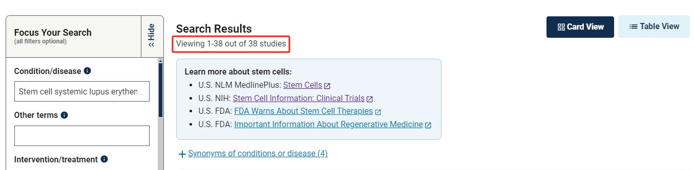 截止2024年3月,在美國國立衛(wèi)生研究院的最大臨床試驗注冊庫clinicaltrials.gov網(wǎng)站上注冊的有關(guān)干細(xì)胞治療系統(tǒng)性紅斑狼瘡的臨床研究項目有38項。