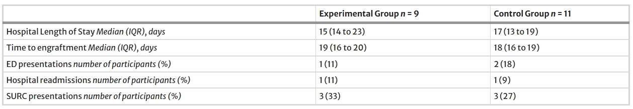 住院時間組間無差異。對照組中有兩名參與者,實驗組中有一名參與者到急診就診,每組各有一名患者在移植后3個月內再次入院(表2)。
