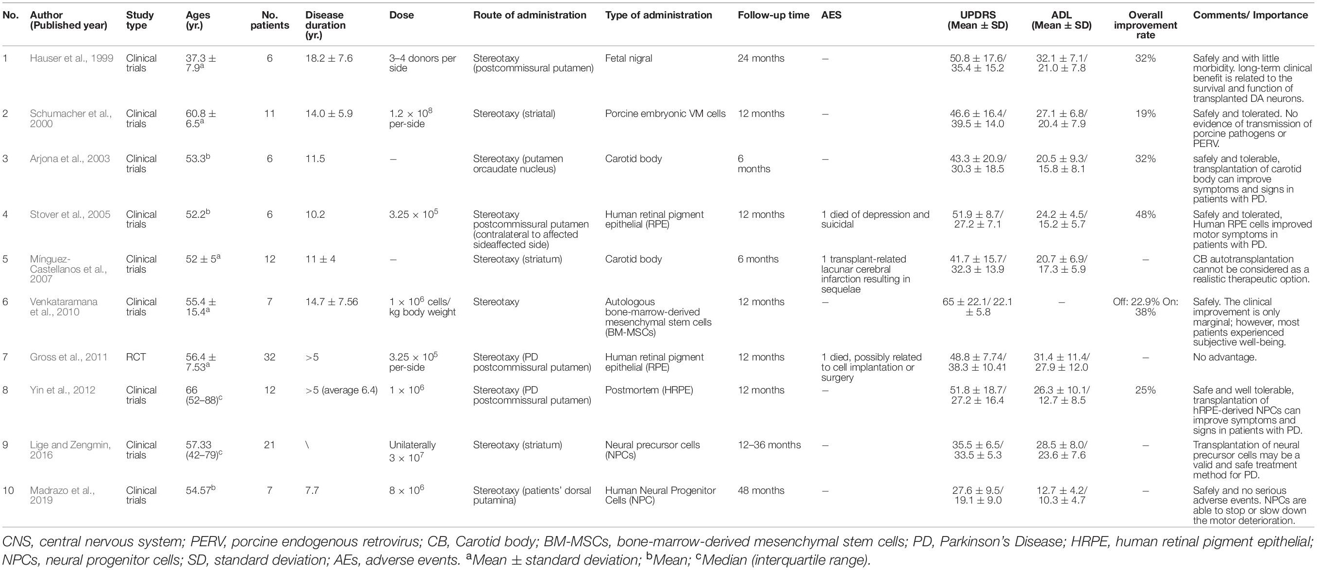 主要結(jié)果:表1顯示了最終文獻綜述中包含的文章的特征。這10項納入的研究是在1999年至2019年期間進行的,包括120名接受細胞療法的帕金森病患者。涉及五種類型的細胞療法,包括人類胎兒、豬胚胎、BM-MSCs、HRPE和NPC。所有研究均采用立體定向移植。七項研究報告了UPDRSIII的顯著改善,2項研究顯示結(jié)果不佳。安全性方面,7篇報道細胞移植安全且耐受性好,3篇報道細胞移植相關(guān)并發(fā)癥,包括抑郁自殺傾向、細胞移植相關(guān)腦梗死(有后遺癥)、細胞移植手術(shù)相關(guān)并發(fā)癥死亡(表1)。