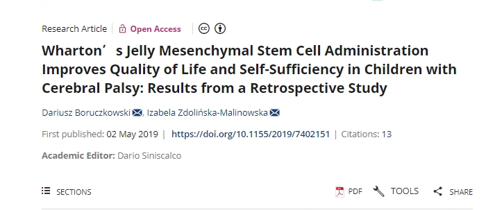 2019年,波蘭干細胞研究中心在《Stem Cells International》上發表了一篇關于“沃頓果凍間充質干細胞治療可改善腦癱兒童的生活質量和自給自足能力:一項回顧性”的研究成果。