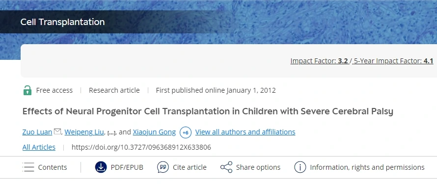 2015年,湖北三甲醫院在國際期刊《全球兒科健康》上發表過一篇關于《人臍血間充質干細胞移植聯合基礎康復治療治療腦癱一例》的臨床研究成果,對一名6個月大的腦癱患者進行了人臍血間充質干細胞移植并長達5年的長期安全隨訪記錄。