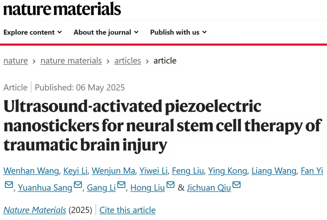Wang, W., Li, K., Ma, W.?et al.?Ultrasound-activated piezoelectric nanostickers for neural stem cell therapy of traumatic brain injury.?Nat. Mater.?(2025). https://doi.org/10.1038/s41563-025-02214-w