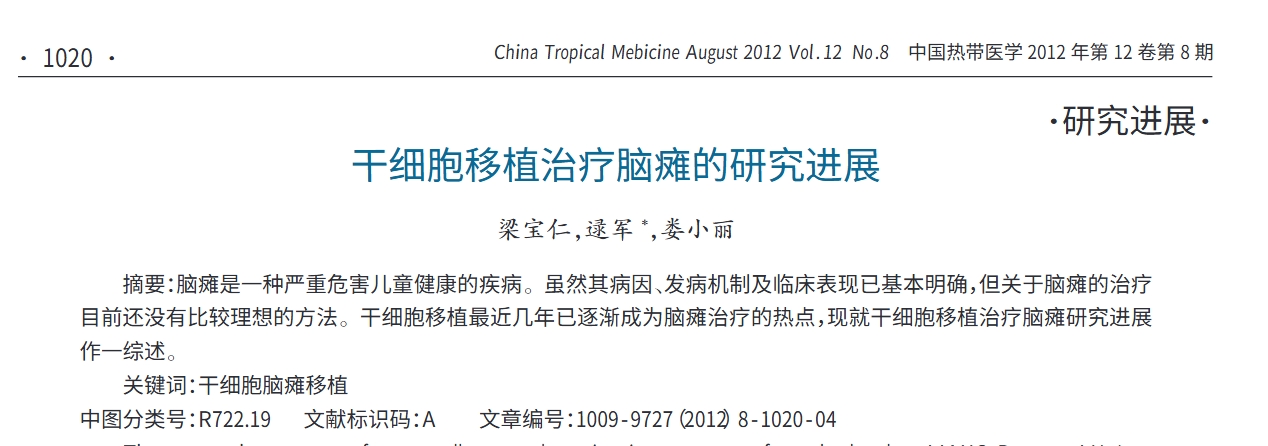 梁寶仁, 逯軍, & 婁小麗.?(2012).?干細胞移植治療腦癱的研究進展.?中國熱帶醫(yī)學,?12(08),?1020-1022+1032.