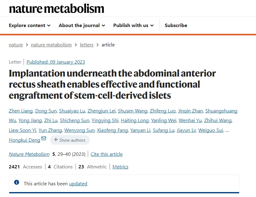 手術(shù)方案安全、 易行、移植物易于長期追蹤觀察,且能夠有效支持hPSC-islets的早期細(xì)胞存活和長期功能維持。團(tuán)隊(duì)將hPSC-islets輸注到糖尿病模型猴的腹直肌前鞘下部位,所有接受移植的糖尿病猴血糖控制均得到了顯著改善;同時(shí),模型猴內(nèi)源性胰島素的分泌水平也得到了大幅提升,且能夠響應(yīng)機(jī)體血糖濃度的變化。相關(guān)研究成果發(fā)表在《Nature Metabolism》 雜志上, 題為 “Implantation underneath the abdominal ?anterior rectus sheath enables effective ?and functional engraftment of stem ?cell-derived islets”。?