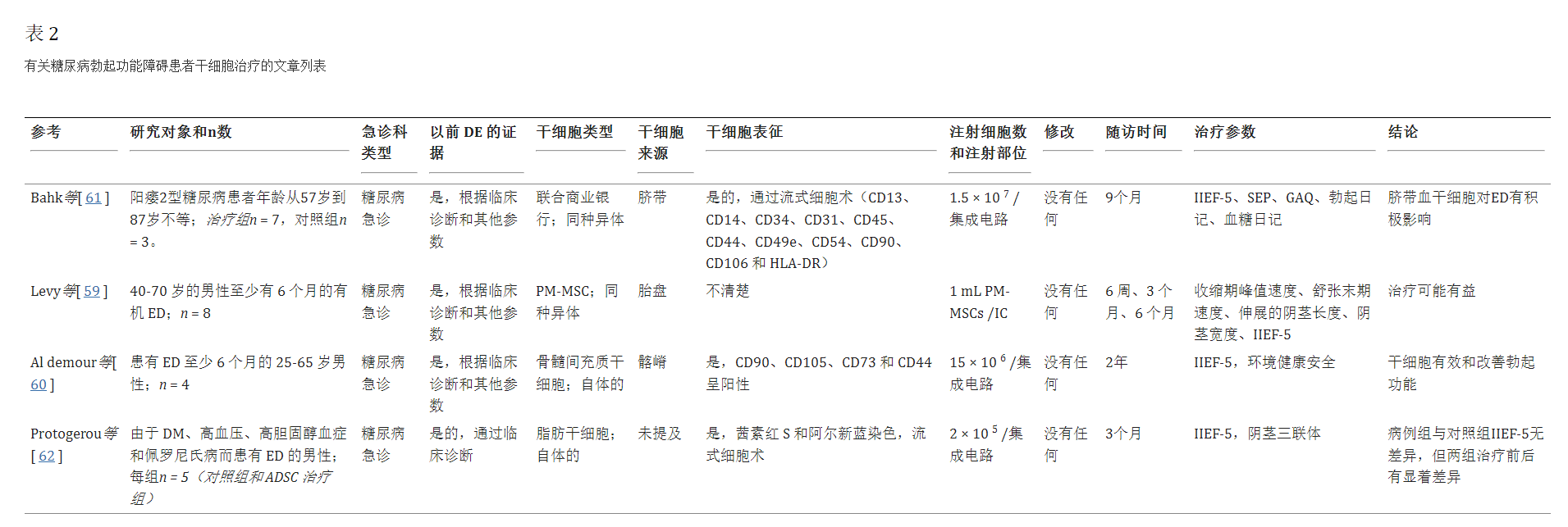 2019年,Protogerou等人報道了一種不同的方法,即使用自體脂肪干細胞治療5名DM患者的ED。將該組與其他五個接受血小板裂解物的人進行了比較。給予的干細胞數(shù)量為2×105個細胞,持續(xù)3個月。在研究結束時,在治療組和對照組之間沒有觀察到IIEF-5的差異。然而,兩組在治療前后均觀察到顯著改善。