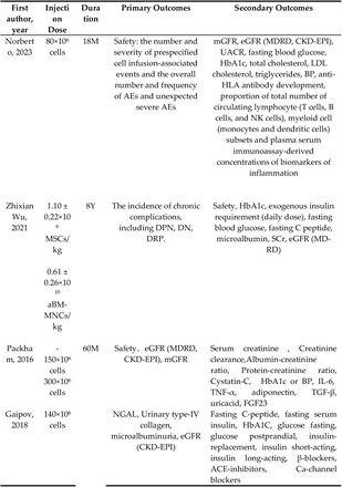 Norberto等人最近進行了一項1b/2a期多中心RCT,以評估成人同種異體骨髓基質干細胞移植對中重度DKD 患者的安全性、耐受性及治療效果。作者發現,18周的SCT導致估計腎小球濾過率(eGFR)顯著改善,但不影響尿微量白蛋白/肌酐比值(UACR)。然而,Gaipov等發現SCT顯著降低微量白蛋白尿(MAU),而不影響eGFR或血清肌酐(SCr)水平。