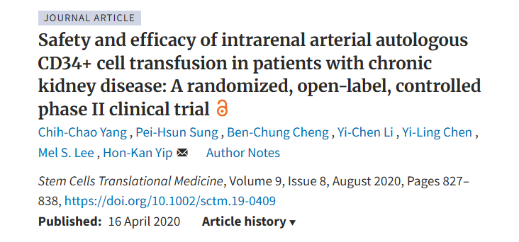 4、Chih-Chao Yang, Pei-Hsun Sung, Ben-Chung Cheng, Yi-Chen Li, Yi-Ling Chen, Mel S. Lee, and Hon-Kan Yip, “Safety and efficacy of intrarenal arterial autologous CD34+ cell infusion in patients with chronic kidney disease: a randomized, open-label, controlled phase II clinical trial”, Stem Cell Translational Medicine, Volume 9, Issue 8, August 2020, Pages 827–838, https://doi.org/10.1002/sctm.19-0409