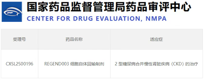 2025年5月,據國家藥品監督管理局藥品審評中心官網公布一款名為“REGEND003”的腎干細胞自體回輸制劑近日獲得了《藥物臨床試驗批準通知書》的新藥注冊臨床試驗I/II期申請(受理號:CXSL2500196),用于治療2型糖尿病合并慢性腎臟疾病(CKD)。
