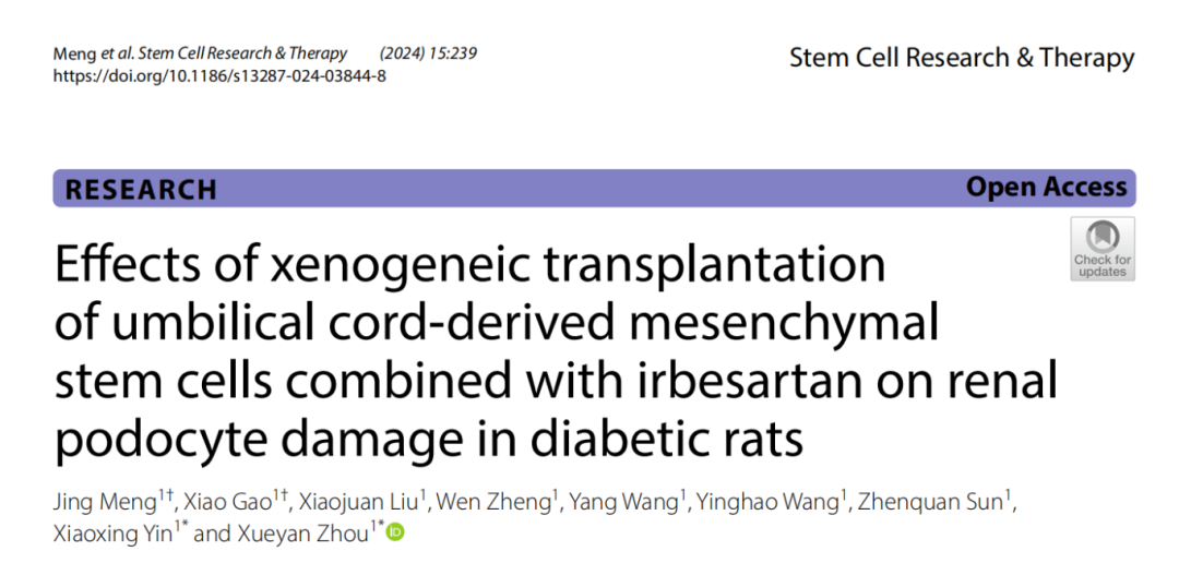 [1]Meng, J., Gao, X., Liu, X.?et al.?Effects of xenogeneic transplantation of umbilical cord-derived mesenchymal stem cells combined with irbesartan on renal podocyte damage in diabetic rats.?Stem Cell Res Ther?15, 239 (2024). https://doi.org/10.1186/s13287-024-03844-8