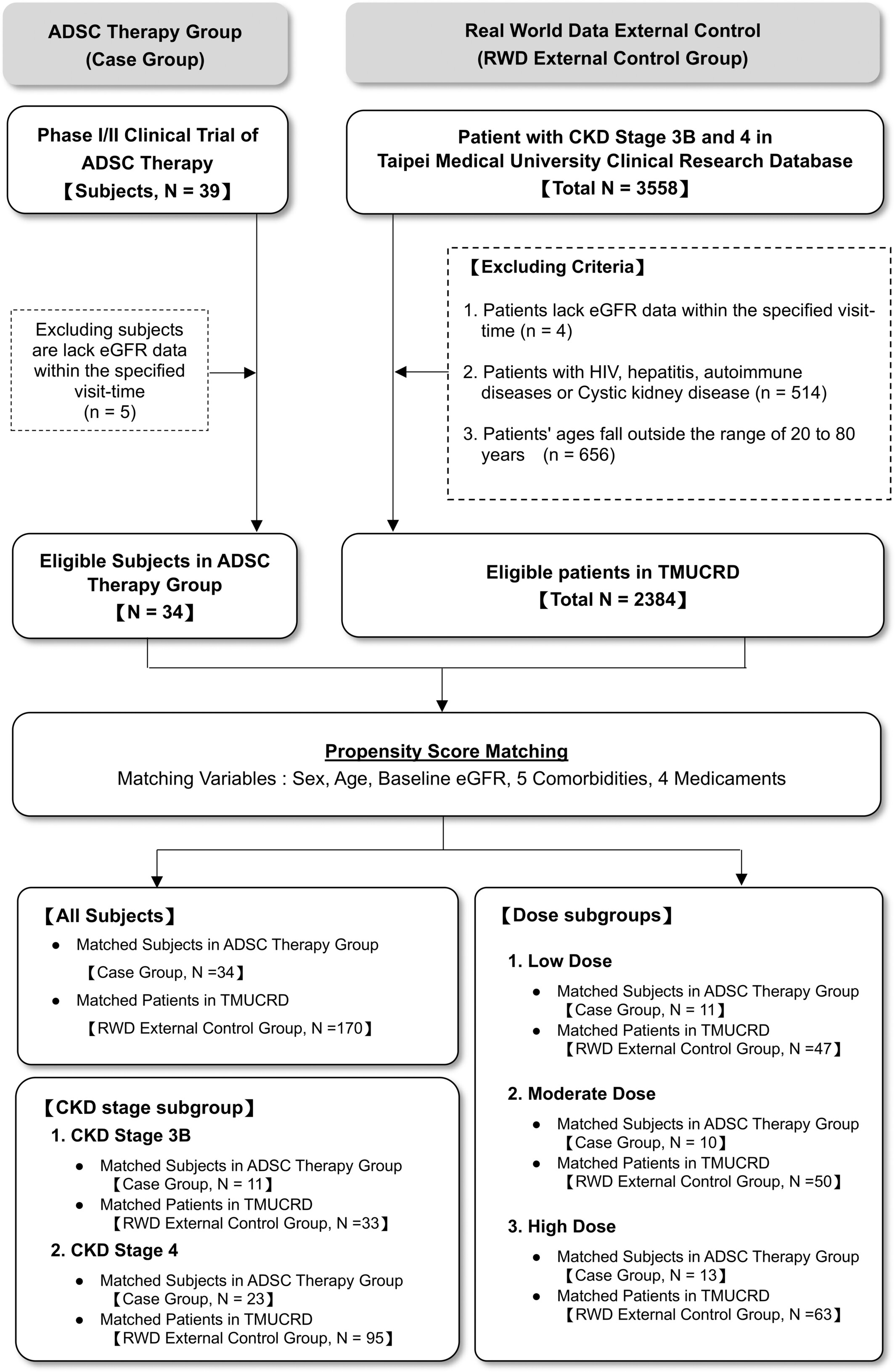 研究設計與統計匹配:為確保兩組可比性,研究采用傾向性評分匹配(PSM)方法,以1:5的比例為每例病例匹配5例對照。最終成功構建了一個由34例ADSC治療組患者和170例RWD外部對照組患者組成的、基線特征(包括年齡、性別、CKD分期、合并癥及用藥)無統計學差異的分析隊列,有效減少了混雜偏倚(圖1)。