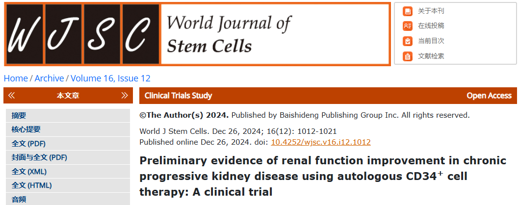 自體CD34+細胞療法改善慢性進行性腎病腎功能的初步證據:一項臨床試驗