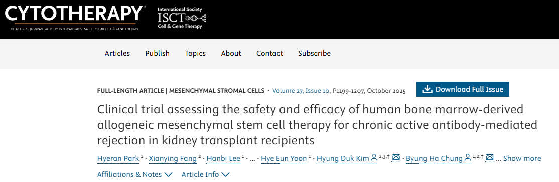 2025年10月,韓國開展的一項單臂研究納入7例慢性活動性抗體介導排斥反應(cABMR)受者,接受同種異體骨髓來源間充質干細胞輸注(4次,每兩周1次,1×10?cells/kg)。結果顯示,治療后估算腎小球濾過率(eGFR)下降斜率由?16.6%減緩至?2.4%,蛋白尿減少,供體特異性抗體(HLA-DSA)平均熒光強度(MFI)降低,T細胞亞群分析提示免疫調節向保護性方向偏移。該研究首次在cABMR人群中證實MSCs不僅安全,且具備延緩功能惡化的潛力。