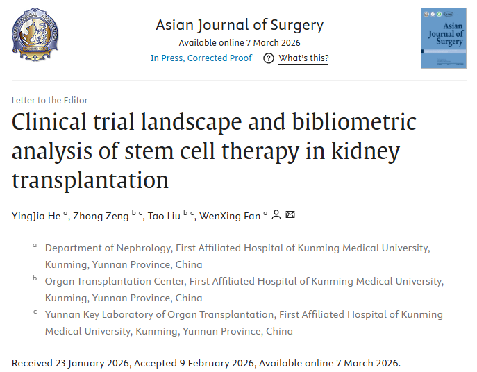 近期,《Asian Journal of Surgery》發表了一篇題為《腎移植中干細胞療法的臨床試驗概況及文獻計量分析》的綜述。該研究整合了臨床試驗注冊數據與文獻計量學方法,系統描繪了該領域的研究現狀、演進脈絡與前沿趨勢,以期為后續研究與臨床決策提供參考[1]