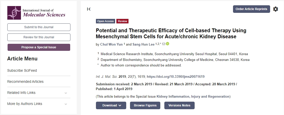 2019年,韓國順天鄉(xiāng)大學首爾醫(yī)院在《國際分子科學雜志》發(fā)布了一篇使用“間充質干細胞治療急性/慢性腎臟病的潛力和治療效果”的論文,這篇綜述討論了最近與腎臟疾病相關的實驗和臨床發(fā)現(xiàn),重點討論了間充質干細胞在腎臟疾病的療效和臨床應用。