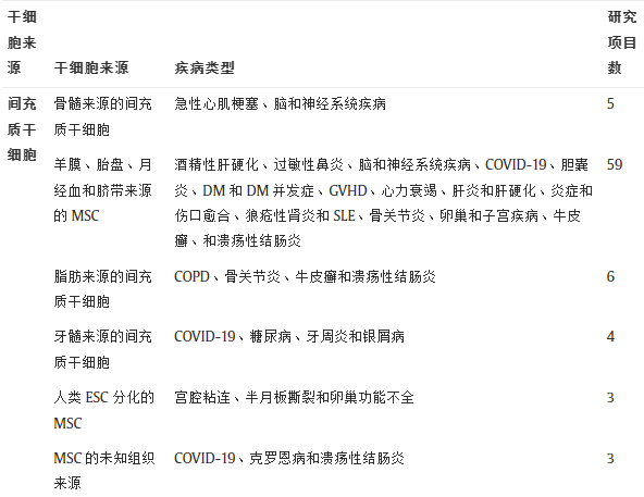 截至2021年10月,約130家三甲醫院獲國家衛健委和國家藥監局授權開展干細胞臨床研究。本節簡要概述了六年的搜索,迄今為止已確定了總共100個臨床研究項目。這些項目在2015年法規實施后已獲得衛生和藥品主管部門的批準。這些臨床研究項目的總結如表1所示。