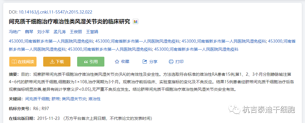 2015年,河南省新鄉市第一人民醫院風濕免疫科開展了間充質干細胞治療難治性類風濕關節炎的臨床研究。