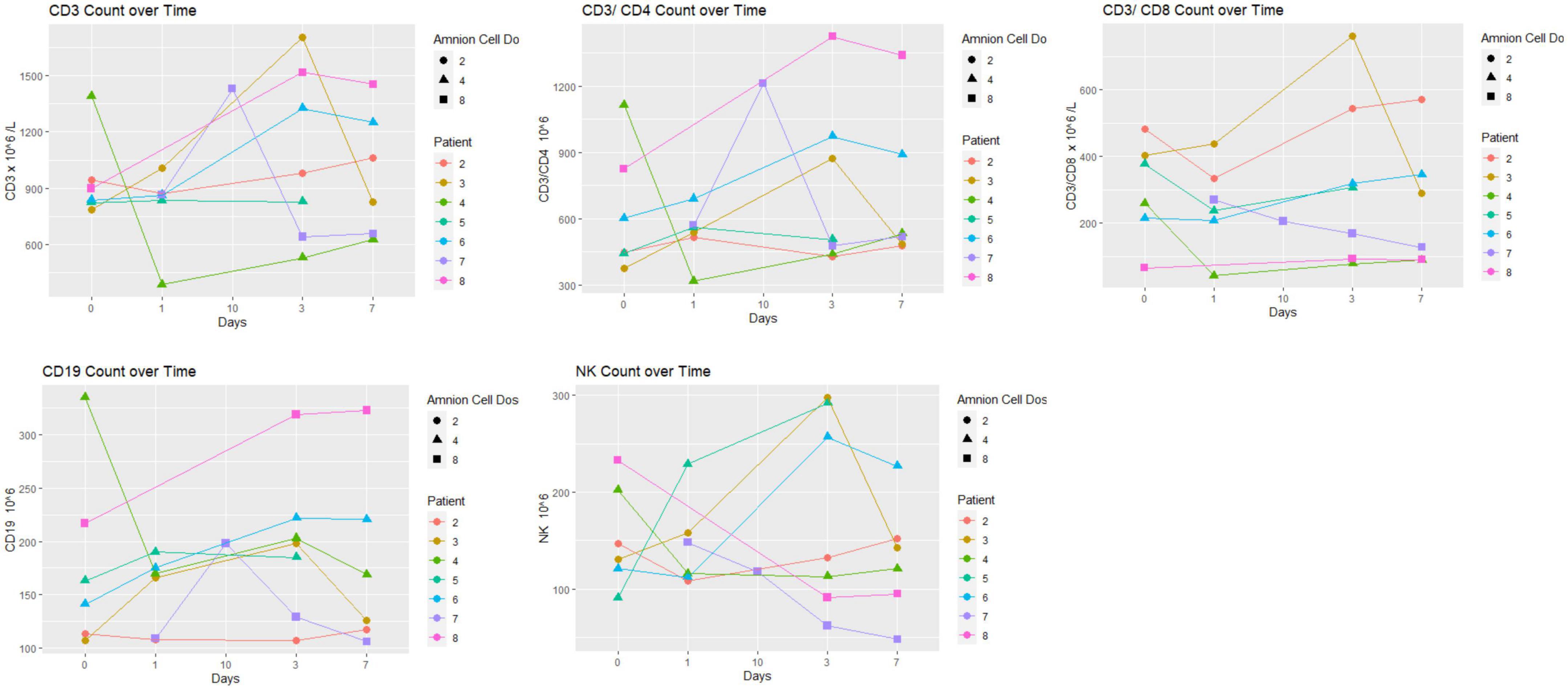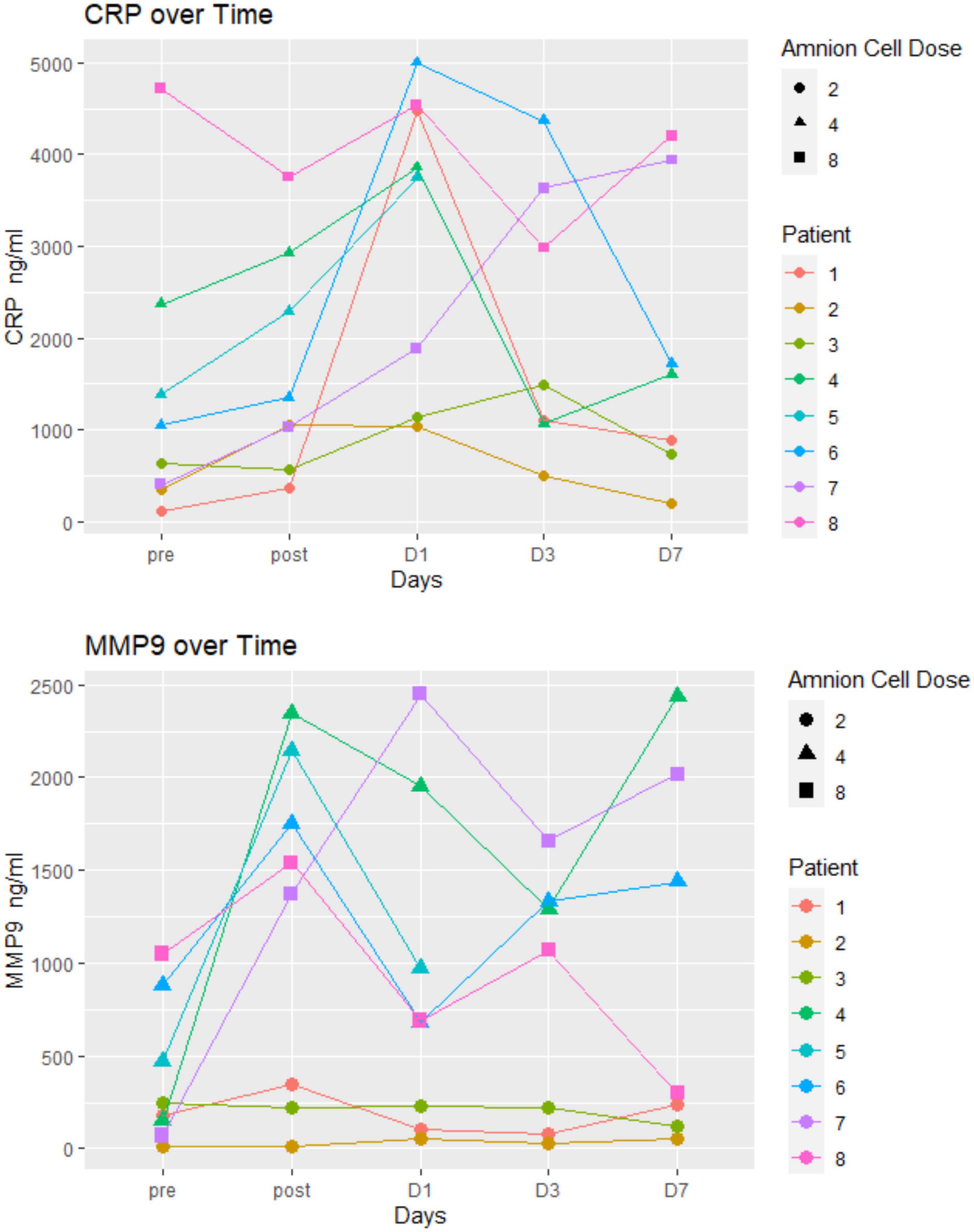 免疫學變化如圖3、4所示。在這8名患者中沒有觀察到特殊的模式。簡而言之,結果沒有顯示出明顯的趨勢,特別是在hAEC的效果方面(例如,接受最高劑量的患者7和8與接受最低劑量的患者1-3之間)。我們無法檢測(或檢測到低水平)幾種炎癥標志物(IFN-γ、IL-6、TNF、IL-10和IL-17)。高敏CRP和MMP-9水平保持在正常范圍內。在三名患者(患者1-3)中,MMP-9水平在第一周內沒有變化。