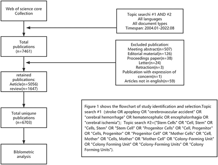 方法:我們使用Web of Science核心合集檢索2004年至2022年間發表的有關中風干細胞的相關文章。使用CiteSpace、VOSviewer和R軟件包“bibliometrix”進行分析,以確定出版物產出、國家/地區、機構、作者/共同被引作者、期刊/共同被引期刊、共同被引參考文獻和關鍵詞。最終,6,703條記錄被納入分析。具體文獻篩選流程見圖1。