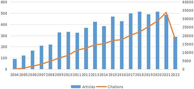 可以看出圖2,直方圖和曲線展示了兩個趨勢:每年發表的論文總數和引用次數。這兩種趨勢隨著時間的推移而增長,說明了該領域研究的發展方向。2004年至2021年間,引用次數顯著且迅速增加,表明干細胞在中風中的研究引起了人們的興趣。2004年至2007年,文獻數量快速增長,2009年更是大幅增長。不過,2010年至2017年的文章數量保持相對穩定。2020年是近年來發表數量最多的一年,峰值為515篇。雖然2022年的數據尚未完成,但預計將呈現出與上年相比,呈溫和趨勢。