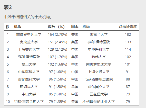 在中風干細胞研究方面排名前三的國家是美國、中國和日本。排名前十的國家有四個歐洲國家、四個亞太國家和兩個美洲國家。此外,前10名的研究機構中,有5家是美國的,其余5家是中國的。我們觀察到德國、日本、中國和美國這四個國家之間的密切配合。中國還積極與日本、加拿大和英國合作。上海交通大學、首都醫科大學、哈佛大學等學術機構之間合作良好。盡管奧克蘭大學在論文發表方面排名第二,但人們發現它與其他大學的合作有限。這種合作對于這些大學的長期學術進步是有害的。因此,確實有必要多國研究機構密切合作、交流,共同推動中風干細胞治療。