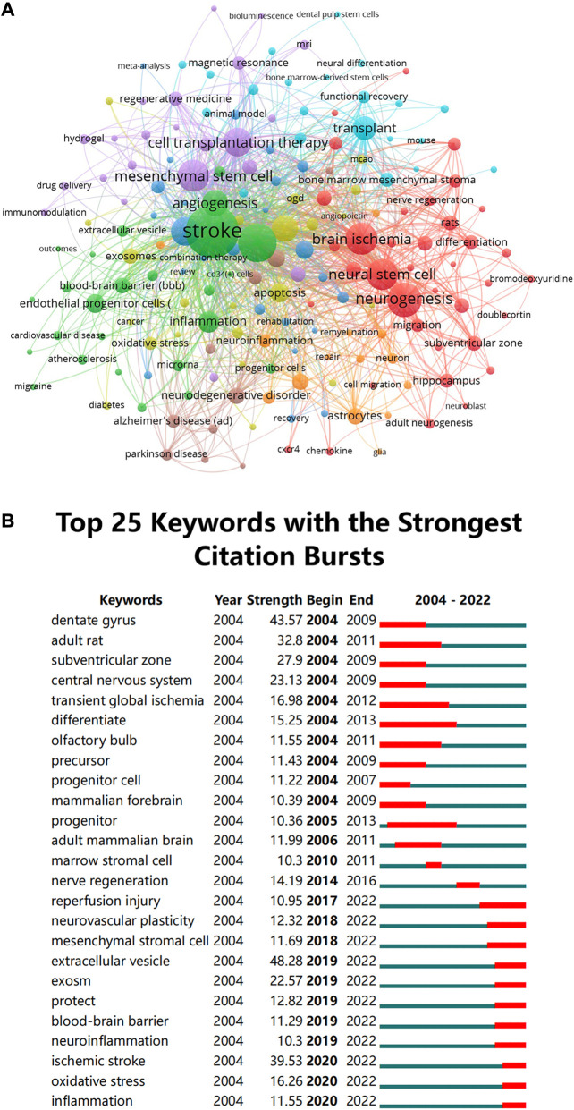 圖5:(A)關鍵詞共現的聚類。圖中的圓圈和標簽構成一個單元,不同顏色的單元構成不同的簇(B)中風干細胞相關引用爆發最強的前25個關鍵詞的CiteSpace可視化圖。