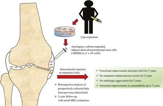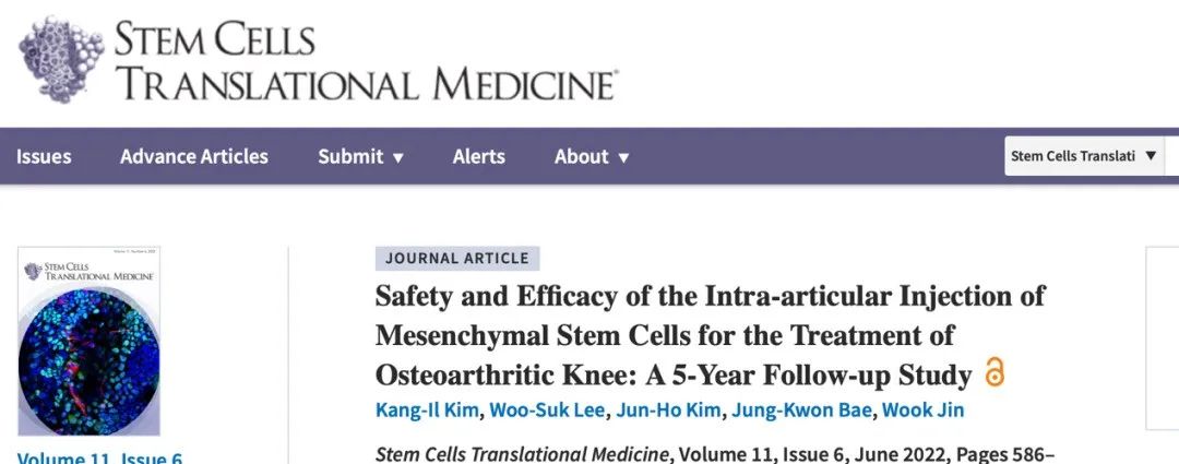 2022年7月,韓國首爾江東慶熙大學醫院發表在《Stems Cells Translational Medcine》的5年隨訪研究證實,通過向關節腔內注射間充質干細胞可安全有效治療膝關節骨性關節炎。研究結果發現,經過間充質干細胞治療的膝骨關節炎患者在注射后6個月直至隨訪結束時,膝骨關節疼痛程度更輕且膝骨關節功能狀態更好。
