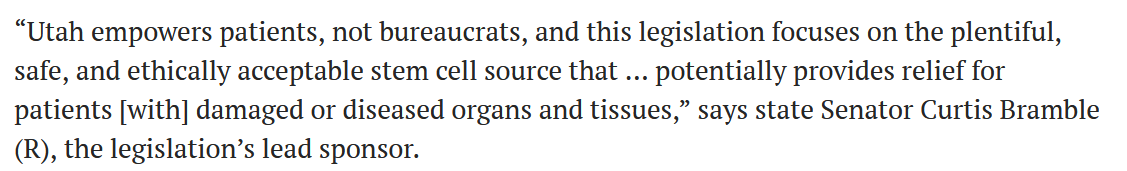 猶他州參議員Curtis Bramble (R)是這項法案的主要發(fā)起人,他表示:猶他州將權(quán)利下放到患者本人,而非政府工作人員,法案通過的是豐富的、安全的、倫理可接受來源的干細(xì)胞,能夠為組織器官受損的患者提供治療。