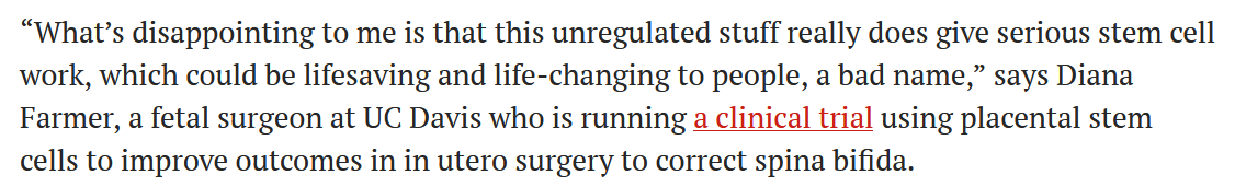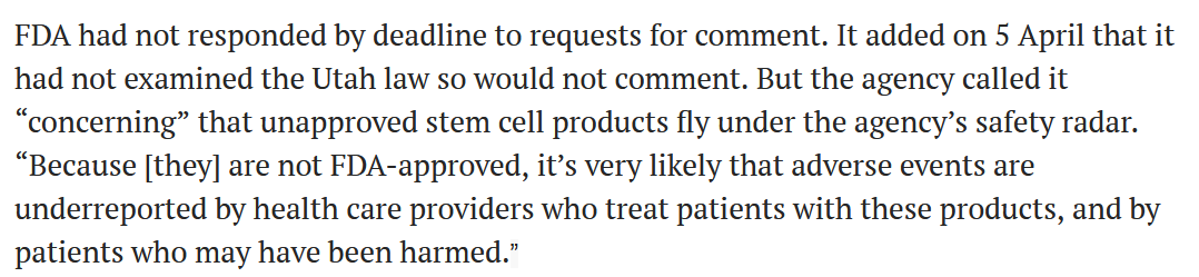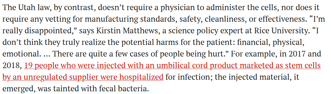 萊斯大學(xué)的科學(xué)政策專家Kirstin Matthews表示:與其他州相比,猶他州的法律不需要醫(yī)生來管理細(xì)胞,也不需要對細(xì)胞的制造標(biāo)準(zhǔn)、安全性、清潔度和有效性進(jìn)行審查,政府工作人員并未認(rèn)識到這對患者在經(jīng)濟(jì)上、身體上和情感上的傷害,在2017年和2018年就發(fā)生過19人因注射了市面上銷售的不受監(jiān)管的臍帶干細(xì)胞產(chǎn)品,感染住院,后被發(fā)現(xiàn),注射的材料被糞便細(xì)菌污染了。