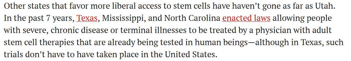在過去7年,德克薩斯州、密西西比州和北卡羅來納州頒布了法律,允許患有嚴(yán)重、慢性疾病或晚期疾病的患者由醫(yī)生使用成人干細(xì)胞療法進(jìn)行治療,這種療法已經(jīng)在人體中進(jìn)行了測試,但這種試驗不需要在全美國進(jìn)行。