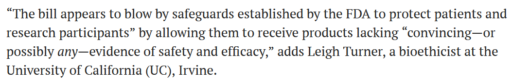 加州大學(xué)生物倫理學(xué)家 Leigh Turner表示:這一法案沖破了FDA為患者和受試者建立的安全屏障,讓他們接受缺乏安全性和有效性證據(jù)的產(chǎn)品。