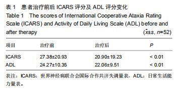 采用世界神經(jīng)病聯(lián)合會(huì)國(guó)際合作共濟(jì)失調(diào)量表(ICARS)對(duì)患者治療前后神經(jīng)功能進(jìn)行評(píng)定,分值越高表示神經(jīng)功能缺損越嚴(yán)重,采用日常生活能力量表(ADL)對(duì)患者治療前后的日常生活能力量進(jìn)行評(píng)估,分值越低,日常生活能力越強(qiáng)。治療后對(duì)患者進(jìn)行隨訪。