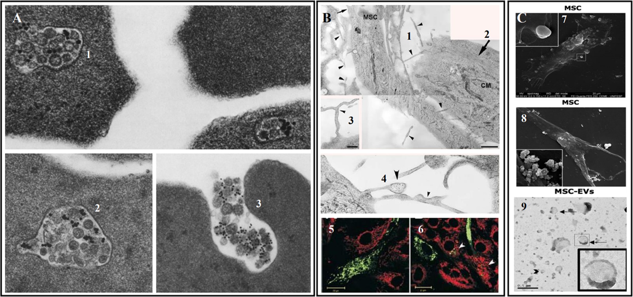 盡管早期有證據(jù)表明MSC直接分化和細(xì)胞替換,但最近的研究強(qiáng)烈表明,它們最重要的作用機(jī)制可歸因于它們能夠分泌旁分泌因子,包括細(xì)胞外囊泡 (EV) 和細(xì)胞因子,將線粒體轉(zhuǎn)移到附近的細(xì)胞 (圖2)、遷移并改變免疫反應(yīng)(免疫調(diào)節(jié))。
