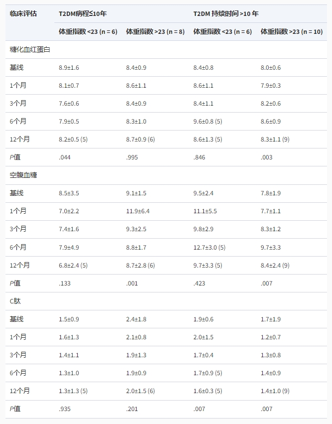干細胞對2型糖尿病治療的結(jié)果的進一步分析顯示,患有2型糖尿病不到10年且體重指數(shù)(BMI)低于23kg/m2的患者的HbA1c水平顯著降低(P=.045;表2)。小于10年的2型糖尿病患者在給藥后12個月顯示FBG水平降低;特別是BMI低于23kg/m2的患者,F(xiàn)BG水平從基線時的8.5±3.5mmol/L下降到給藥后12個月時的6.8±2.4mmol/L。除BMI高于23kg/m2的患者外,所有10年以上的T2DM患者的HbA1c、FBG和C肽水平均未表現(xiàn)出任何顯著變化,他們在干預后的HbA1c和FBG水平略有增加。與正常范圍相比,基線C肽水平相對較低,與T2DM病程和患者BMI無關,給藥后觀察到C肽水平呈下降趨勢,特別是在有T2DM病史的患者中10年 ( P<0.07; 表2)。