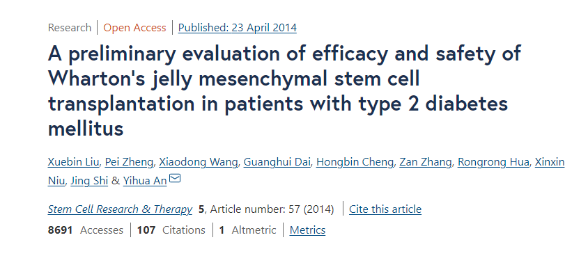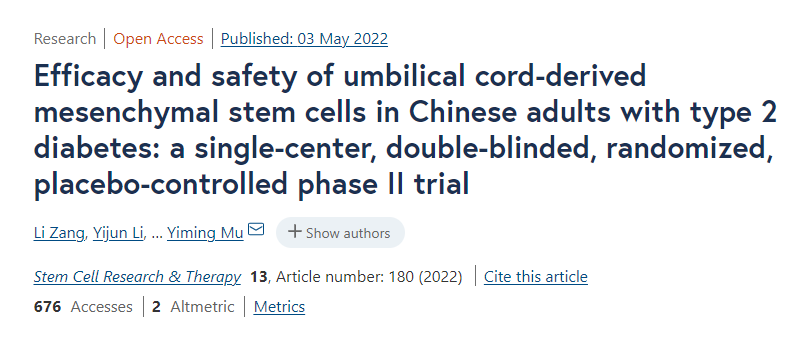 此外,解放軍總醫院內分泌科母義明教授、生物治療中心韓衛東教授等人也在Stem Cell Res Ther期刊上發表了一項單中心、隨機、雙盲、安慰劑對照試驗的結果,考察了臍帶間充質干細胞治療2型糖尿病的有效性和安全性。