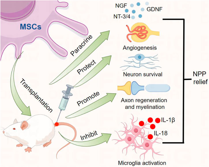 總結:這些研究表明MSCs可以分化神經元,保護神經元存活,促進軸突再生和髓鞘形成,達到鎮(zhèn)痛作用,通過促進軸突再生、保護神經元存活來取代軸突溶解脫髓鞘和神經元分化是緩解NPP的關鍵(圖1)。
