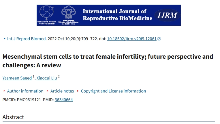 Saeed Y, Liu X. Mesenchymal stem cells to treat female infertility; future perspective and challenges: A review. Int J Reprod Biomed. 2022 Oct 10;20(9):709-722. doi.org/10.18502/ijrm.v20i9.12061