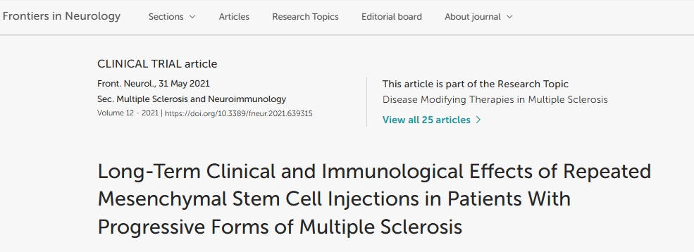 2021年,“神經病學前沿”雜志子刊“多發性硬化癥和神經免疫學”發表了一篇“間充質干細胞重復注射對進展型多發性硬化癥患者的長期臨床和免疫學影響”的研究文章。