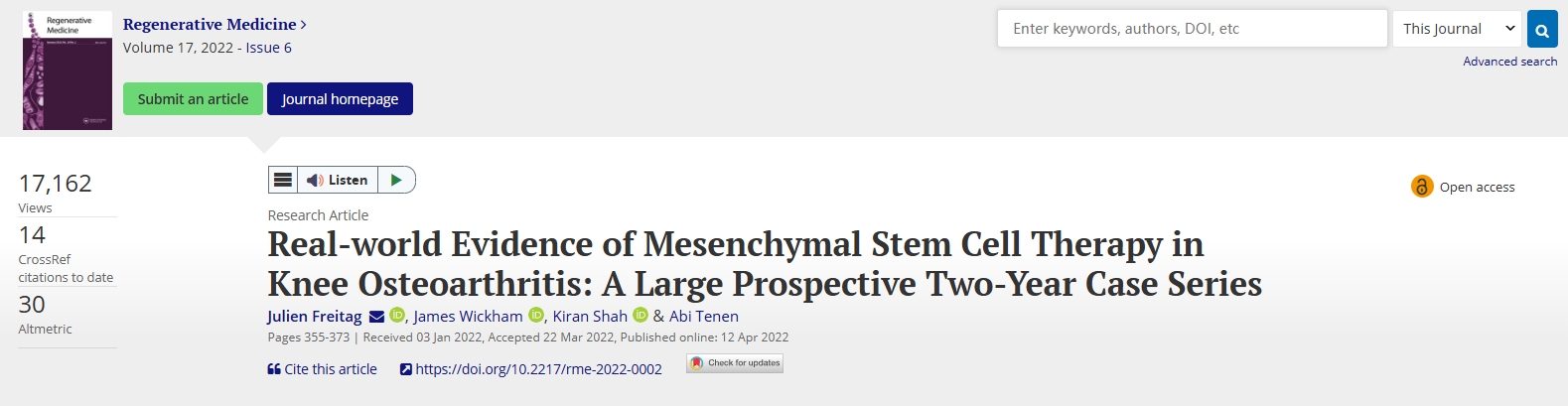 Freitag, J., Wickham, J., Shah, K., & Tenen, A. (2022). Real-world Evidence of Mesenchymal Stem Cell Therapy in Knee Osteoarthritis: A Large Prospective Two-Year Case Series. Regenerative Medicine, 17(6), 355–373. https://doi.org/10.2217/rme-2022-0002