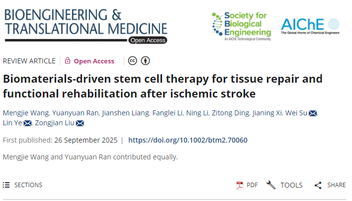 [12]Wang M, Ran Y, Liang J, et al. Biomaterials-driven stem cell therapy for tissue repair and functional rehabilitation after ischemic stroke. Bioeng Transl Med. 2025; 10(6):e70060. doi:10.1002/btm2.70060