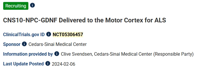 [3]:Baloh, R.H., Johnson, J.P., Avalos, P. et al. Transplantation of human neural progenitor cells secreting GDNF into the spinal cord of patients with ALS: a phase 1/2a trial. Nat Med 28, 1813–1822 (2022). https://doi.org/10.1038/s41591-022-01956-3