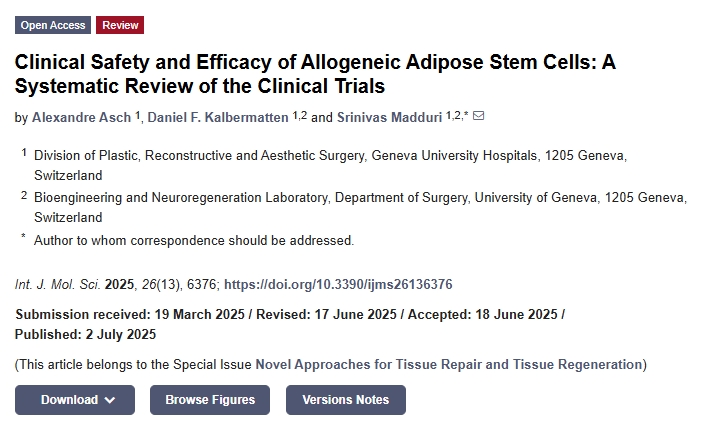 [1]:Asch A, Kalbermatten DF, Madduri S. Clinical Safety and Efficacy of Allogeneic Adipose Stem Cells: A Systematic Review of the Clinical Trials. Int J Mol Sci. 2025 Jul 2;26(13):6376. doi: 10.3390/ijms26136376. PMID: 40650153; PMCID: PMC12249789.