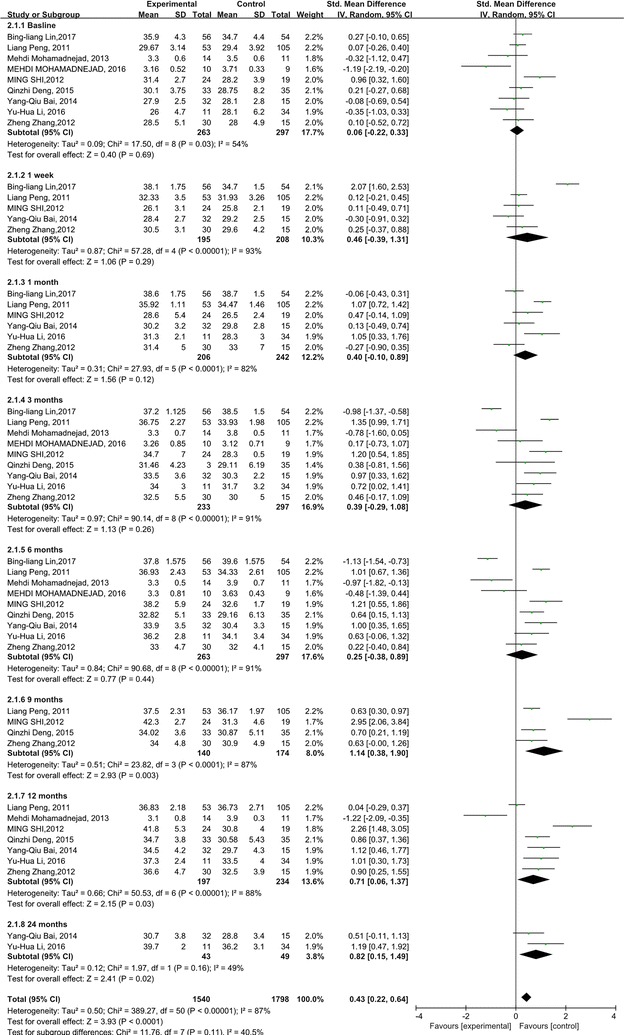 我們分析了ALB和INR水平,以研究干細胞療法對肝臟合成功能的影響。與對照組相比,干細胞治療后ALB 水平顯著升高 (p<0.0001)。但應(yīng)考慮ALB水平的異質(zhì)性(p<0.00001;I2=87%)。亞組分析顯示,干細胞治療后9、12、24個月ALB水平顯著升高(圖2)。