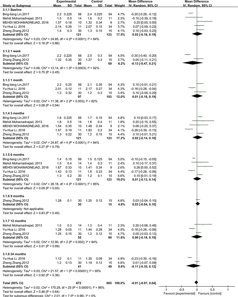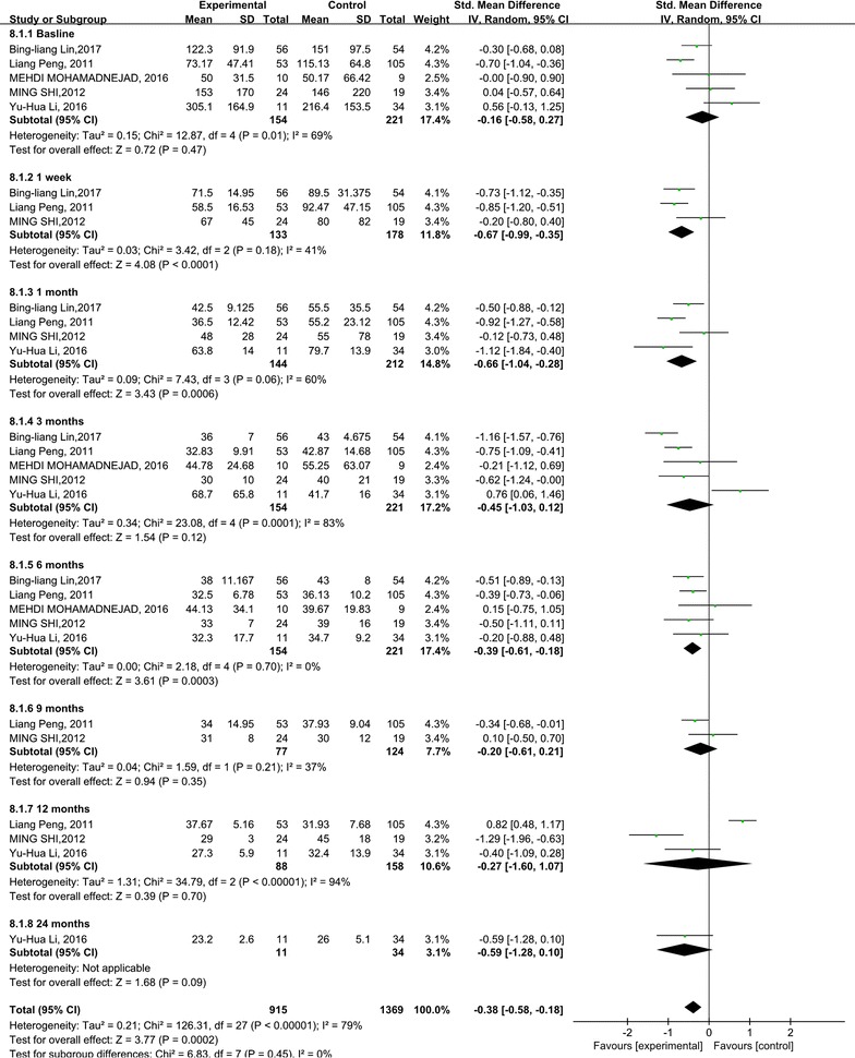 與對照組相比,干細胞治療后ALT水平顯著降低(p<0.00001)(圖5)。亞組分析顯示,干細胞治療組ALT水平也有所降低,在1周、1個月和6個月時間點均低于基線和相應(yīng)對照組。干細胞治療后9、12和24個月時ALT水平無顯著差異。關(guān)于1周、6和9個月時的ALT水平,未發(fā)現(xiàn)異質(zhì)性。但是,應(yīng)考慮1、3和12個月時 ALT水平的異質(zhì)性。但這只能通過一兩項研究來解釋。