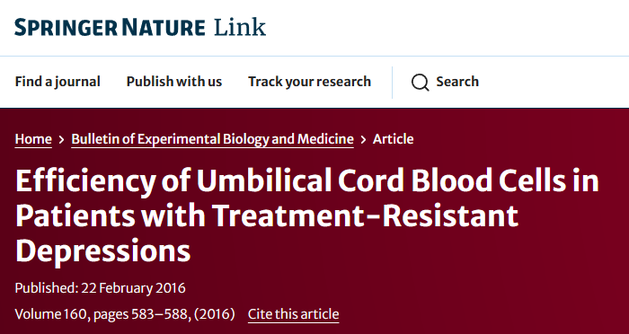 2016年,Smulevich等人進行了一項值得注意的研究,他們研究了臍帶血細胞對難治性抑郁癥女性的治療潛力。參與者每周注射2.5億個濃縮臍帶血細胞,每四周一次。對照組接受安慰劑注射。雖然兩組的抑郁癥狀和低情境化癥狀均有所減輕,但治療組在難治性和抑郁嚴重程度方面顯示出延遲但更明顯的改善。此外,在干細胞治療組中還觀察到長期認知改善。