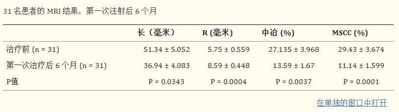 結果:所有患者的運動功能、膀胱功能和日常生活都有改善。沒有患者報告有任何副作用。MRI成像顯示椎管病變長度明顯改變,脊髓增粗。心理改善在移植后六個月最高,在移植后一個月最低。治療后生活質量改善的患者比例為100%,而80%的患者對治療結果感到滿意。