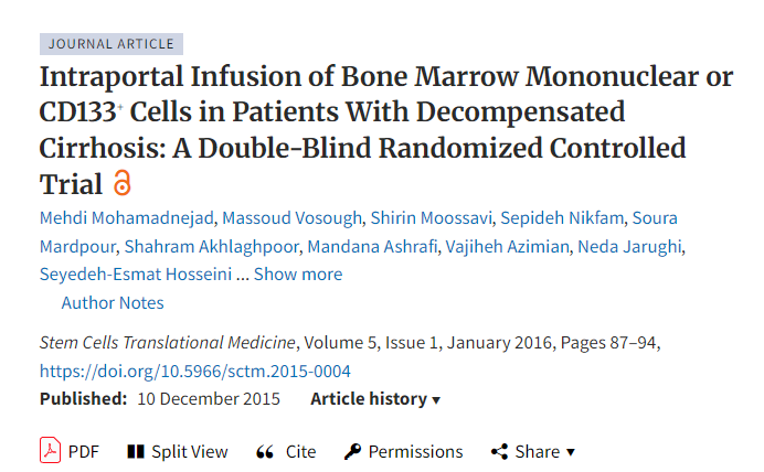 [2]Mohamadnejad M, Vosough M, Moossavi S, Nikfam S, Mardpour S, Akhlaghpoor S, Ashrafi M, Azimian V, Jarughi N, Hosseini SE, Moeininia F, Bagheri M, Sharafkhah M, Aghdami N, Malekzadeh R, Baharvand H. Intraportal Infusion of Bone Marrow Mononuclear or CD133+ Cells in Patients With Decompensated Cirrhosis: A Double-Blind Randomized Controlled Trial. Stem Cells Transl Med. 2016 Jan;5(1):87-94. doi: 10.5966/sctm.2015-0004. Epub 2015 Dec 10. PMID: 26659833; PMCID: PMC4704869.