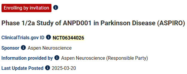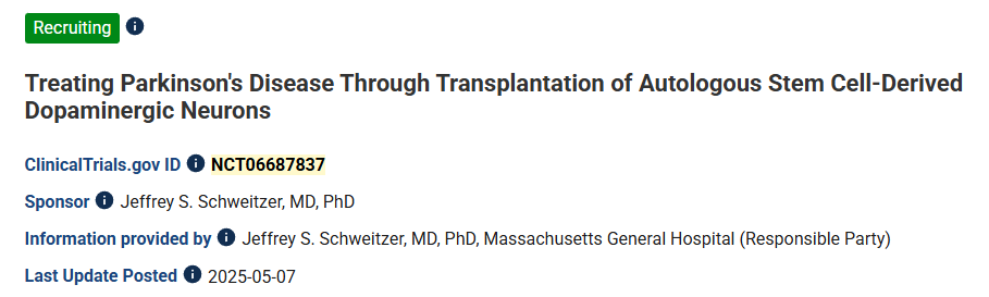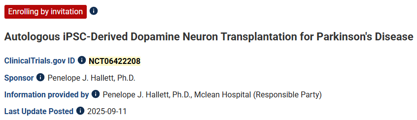 [1]:1.Kayhanian S, Barker RA. Clinical trial highlights: Dopamine cell-replacement therapies. Journal of Parkinson’s Disease. 2025;0(0). doi:10.1177/1877718X251397277.