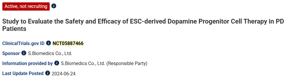 02、標題:評估人胚胎干細胞衍生中腦多巴胺神經元細胞療法(MSK-DA01)治療晚期帕金森病的安全性和耐受性的I期研究