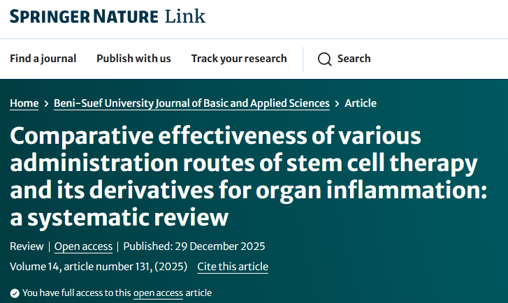 [1]:Purwatiningsih, W., Rantam, F., Aulanni’am, A. et al. Comparative effectiveness of various administration routes of stem cell therapy and its derivatives for organ inflammation: a systematic review. Beni-Suef Univ J Basic Appl Sci 14, 131 (2025). https://doi.org/10.1186/s43088-025-00730-x