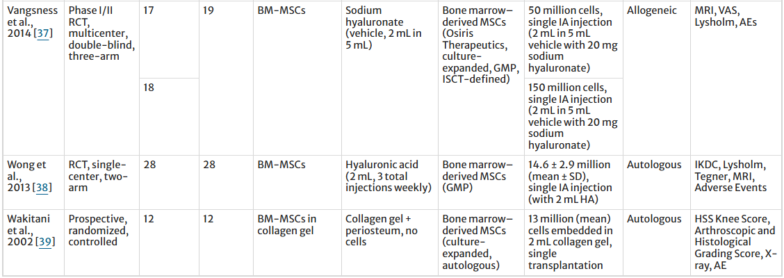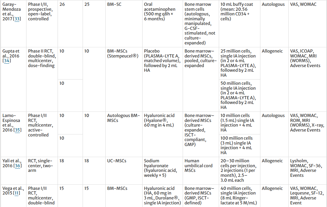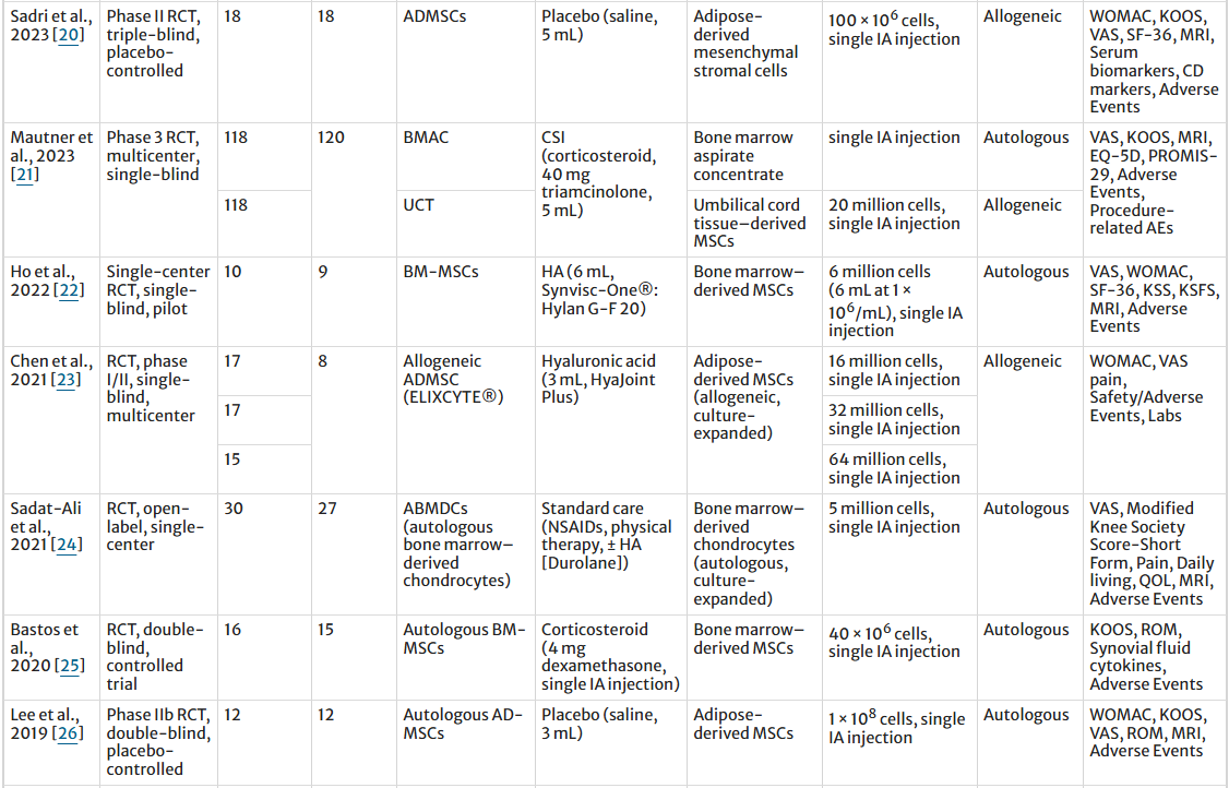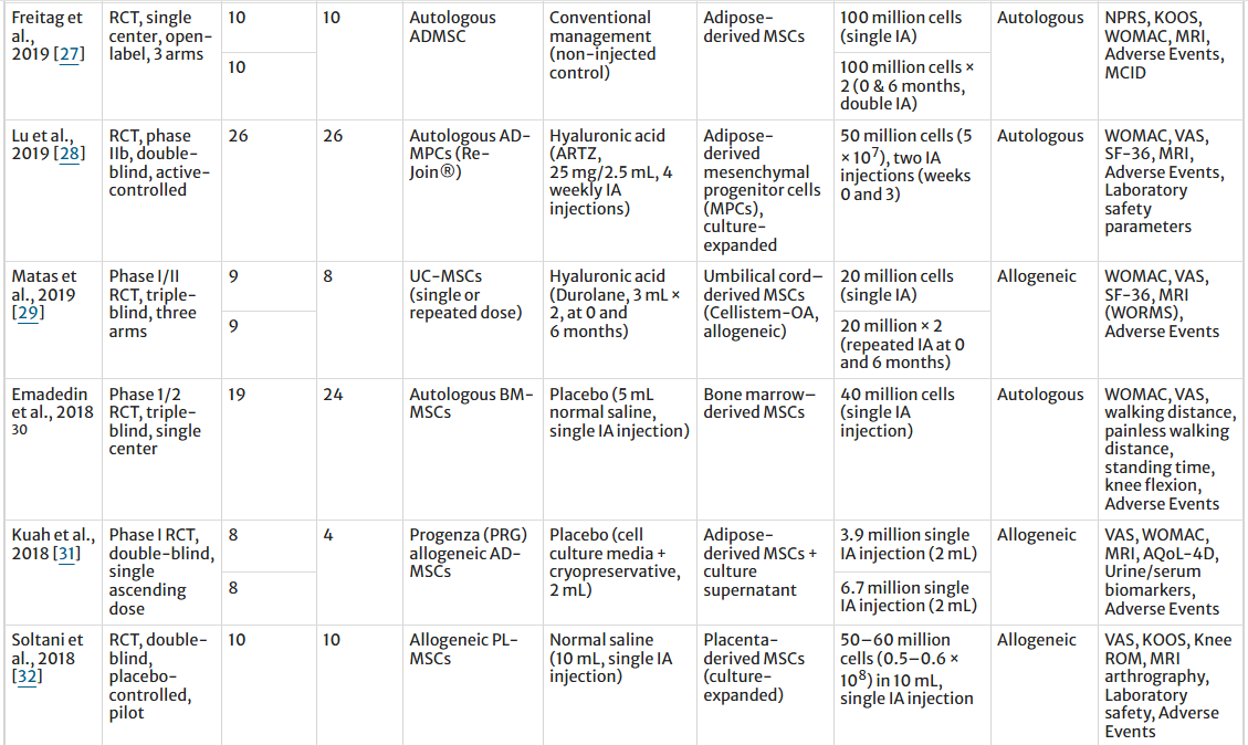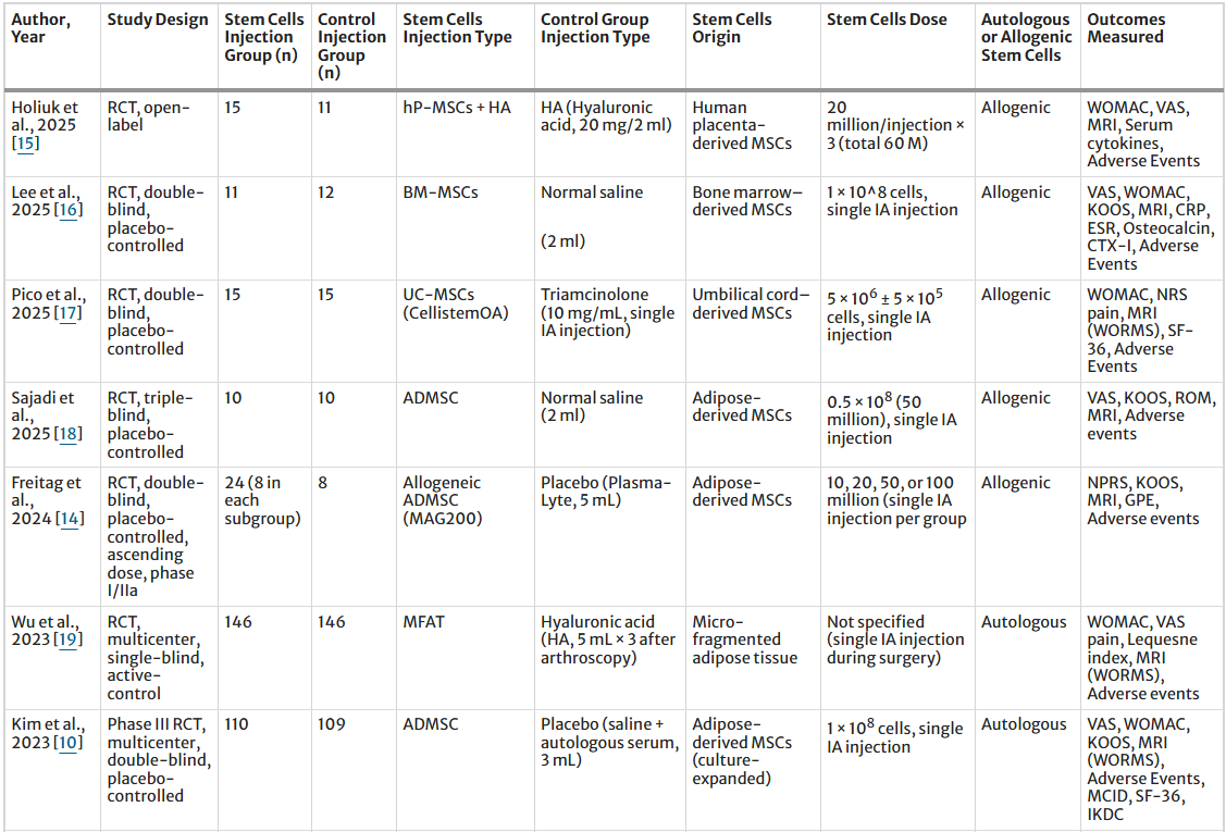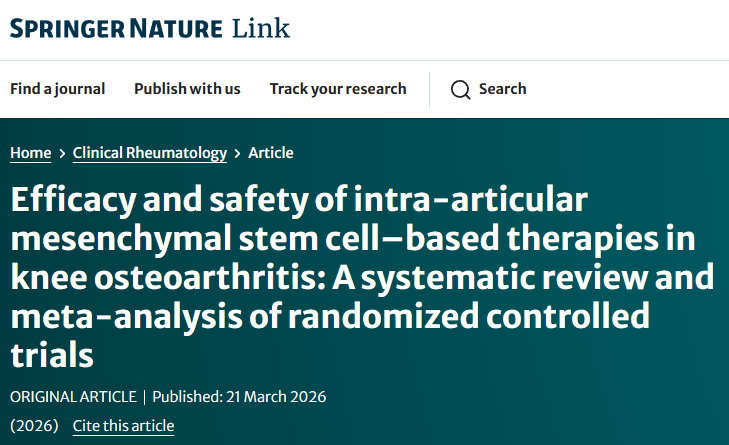 [1]:Awad, G., Saad, JP., Hamyeh, A. et al. Efficacy and safety of intra-articular mesenchymal stem cell–based therapies in knee osteoarthritis: A systematic review and meta-analysis of randomized controlled trials. Clin Rheumatol (2026). https://doi.org/10.1007/s10067-026-08042-w
